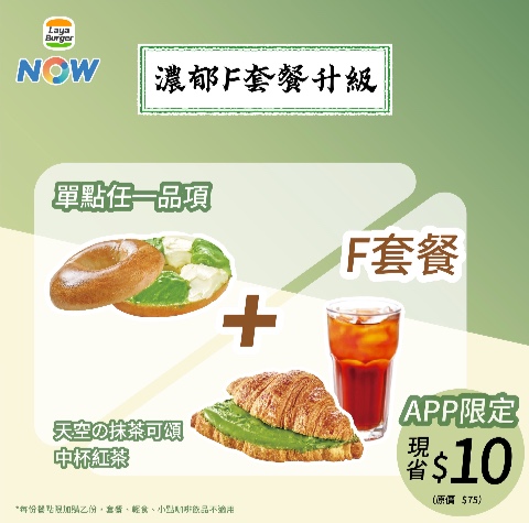 超值新選擇!APP限定單點任一品項升級F套餐天空の抹茶®可頌+中杯紅茶,優惠價$65 (原價$75)。每份餐點限加購乙份,套餐、輕食、小點咖啡品不適用