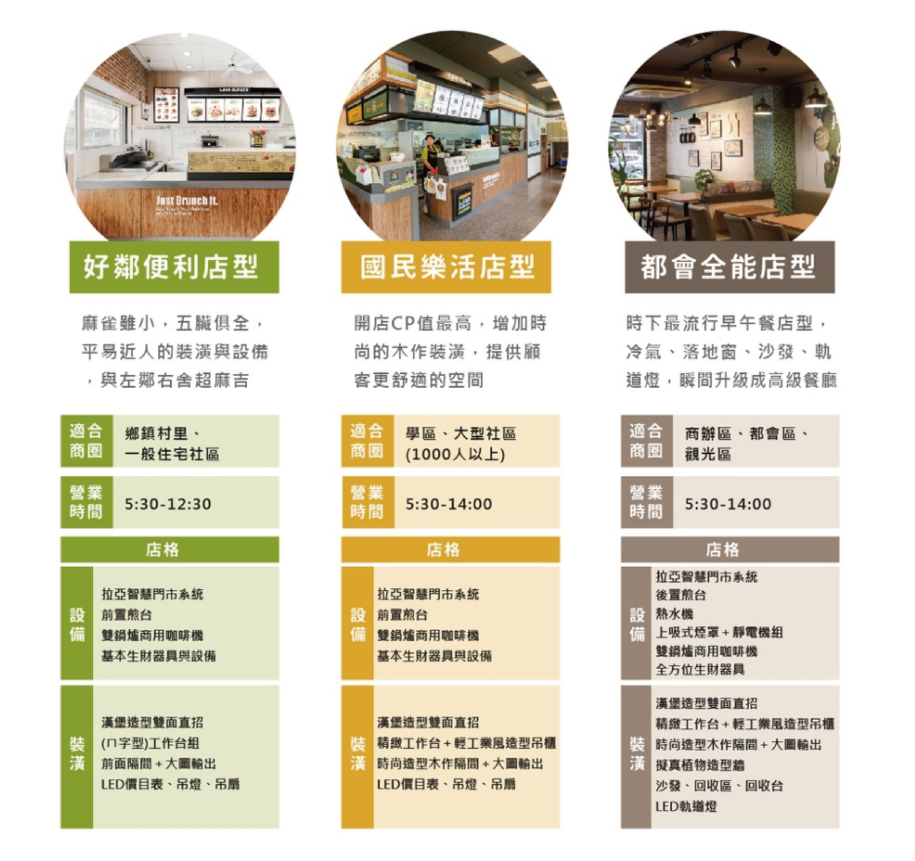 都會全能店型時下最流行早午餐店型,冷氣、落地窗、沙發、軌道燈,瞬間升級成高級餐廳。主要客群商辦區、都會區、觀光區營業時間5:30~14:00店格設 備拉亞智慧門市系統