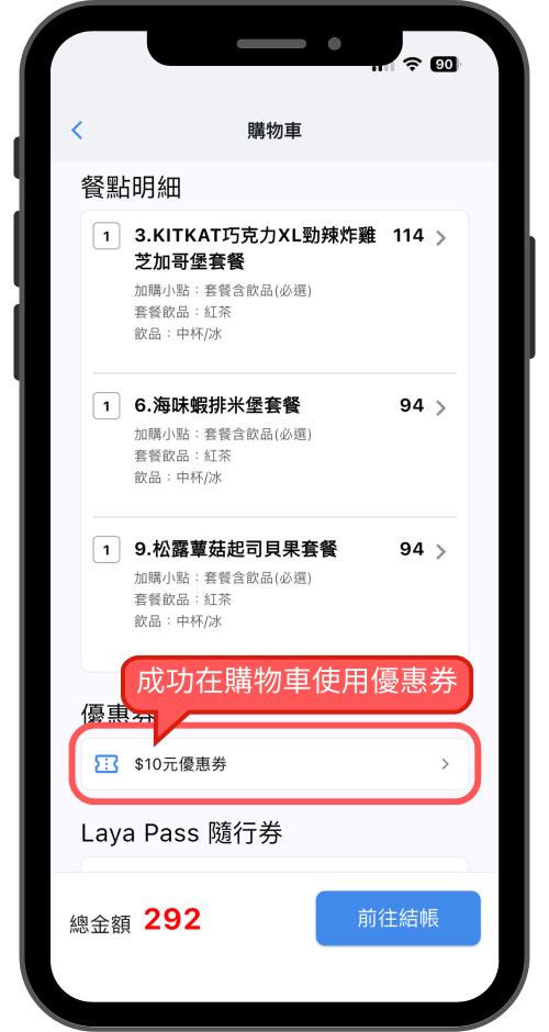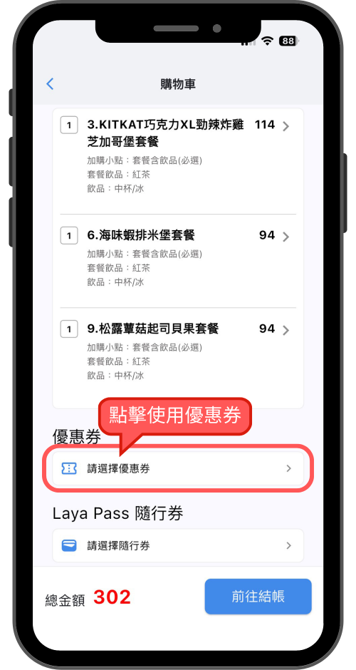 將喜歡的餐點加入購物車,點擊使用『優惠券』按鈕