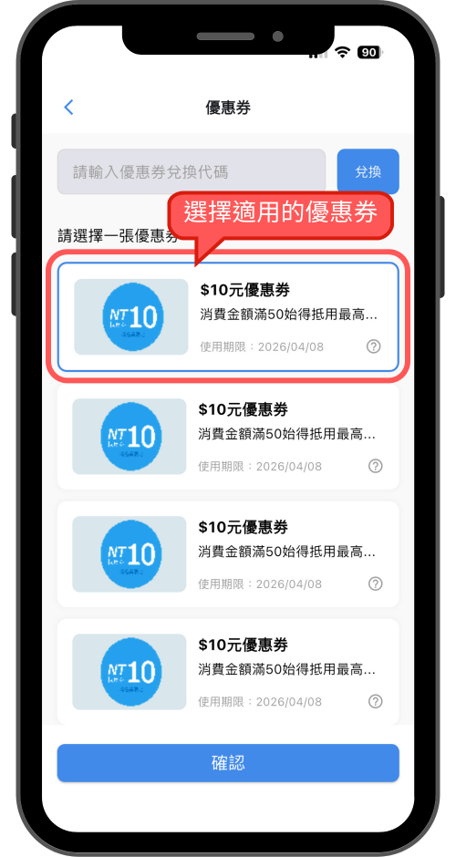 開啟優惠券列表後,選擇1張合適的優惠券